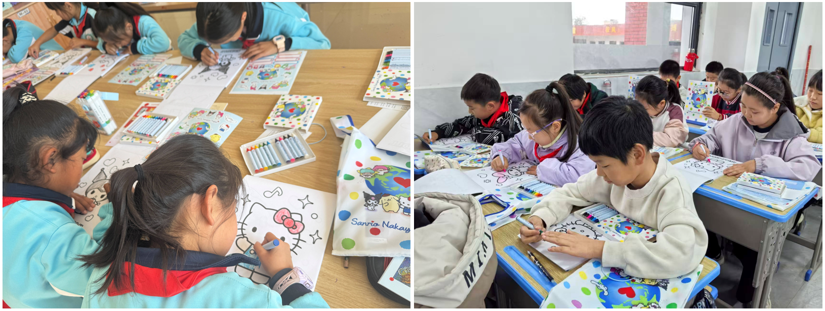 在物资送达学校后,这批物资不仅缓解了学校美育教学的资源压力,更让孩子们感受到来自社会的关注与鼓励。有学生拿起崭新的画笔时兴奋地说:“我终于可以画出心里想画的颜色了!” 孩子们用捐赠的画笔画出了心中的Hello Kitty,一幅幅充满童真与想象力的作品,正是美育在他们心中播下的种子。