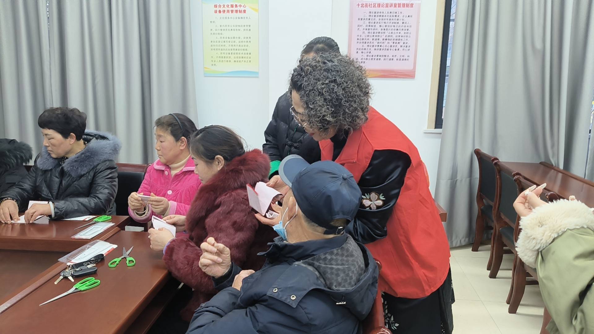 活动现场,在剪纸韩老师的耐心指导下,居民们兴致勃勃地开始了学习。韩老师从最基础、最富吉祥寓意的“双囍”字剪起,手把手地向大家传授折纸方法、剪刀握持技巧以及简单的纹样裁剪步骤。他一边演示,一边讲解剪纸艺术中“图必有意,意必吉祥”的文化内涵,让居民们在动手实践的同时,也深入了解了这项传统技艺背后承载的民俗故事与文化记忆。 参与活动的居民们学习态度非常认真,他们围坐在一起,按照老师的讲解,小心翼翼地折叠红纸,专注地运剪。剪刀在红纸间穿梭,发出清脆悦耳的“咔嚓”声。原本平凡的红纸,在一双双巧手的创作下,逐渐变成了形态各异、寓意美好的窗花。遇到难题时,韩老师与社区志愿者及时上前帮忙指导,现场充满了欢声笑语与互助友爱的温暖氛围。活动不仅让老人们重温了传统年俗的乐趣,也让剪纸这项非物质文化遗产在亲身体验中实现了“活态传承”。