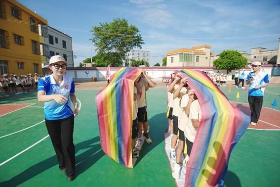 志愿者与孩子们进行趣味互动游戏,挥洒青春与活力